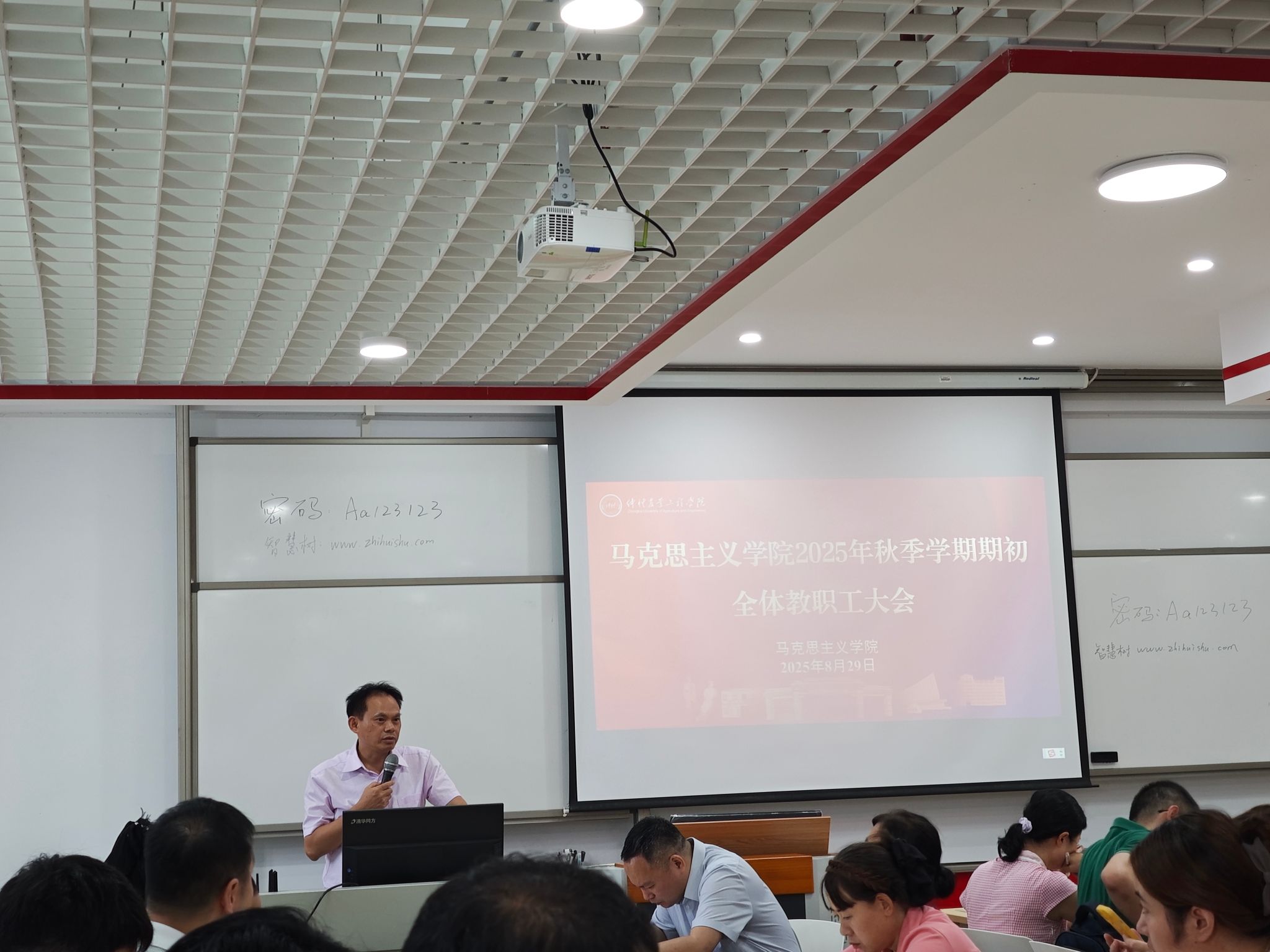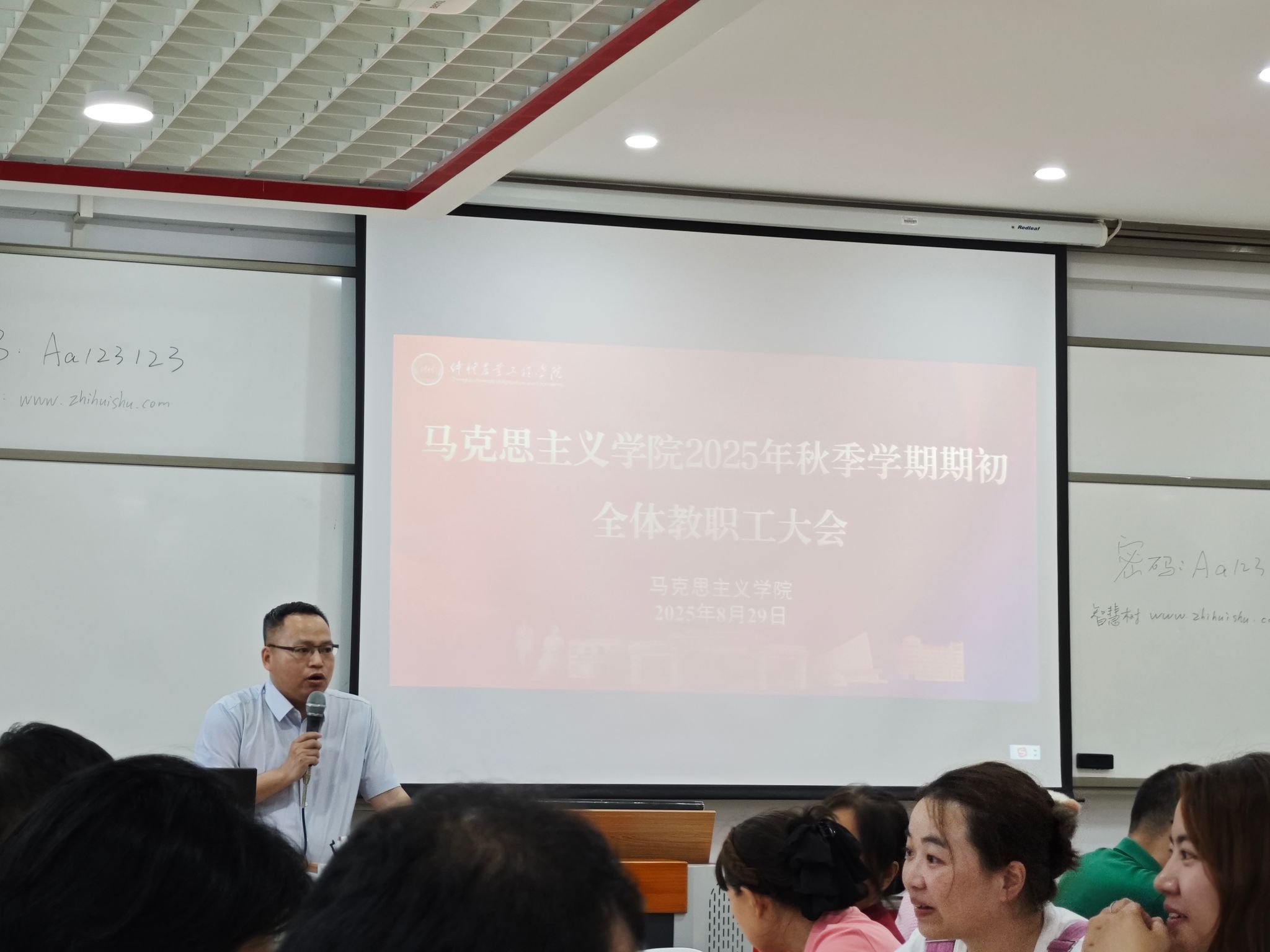 蔡立彬向教职工传达了公司学期初工作会议的精神,强调了公司在新学期的工作任务和重要部署,他表示公司全体教职工务必以使命担当之姿,对标公司发展需求,提升自身教学和科研能力,为公司发展提供“加速度”。