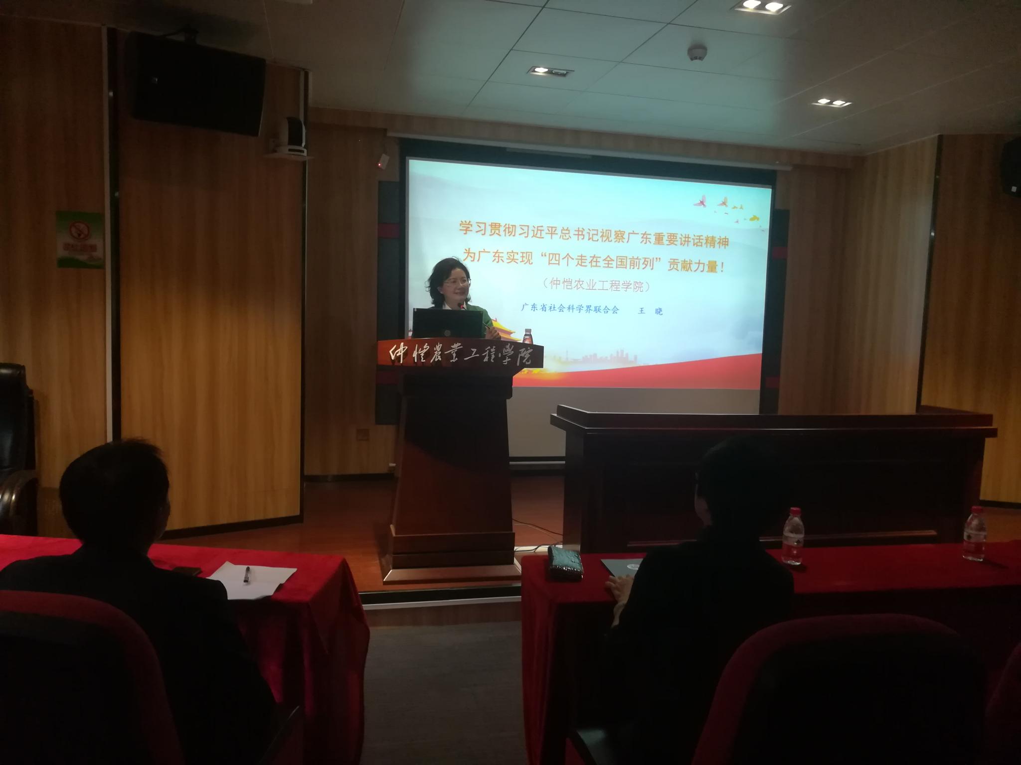 4月18日下午,太阳成集团tyc122cc在英东楼111学术报告厅举行“形势与政策”大讲堂第三讲,讲座主题是“学习贯彻习近平总书记视察广东重要讲话精神——为广东实现‘四个走在全国前列’贡献力量”,由广东省社会科学界联合会党组书记、主席,“习近平总书记视察广东重要讲话精神”省委宣讲团成员王晓同志主讲。报告会由公司党委李海燕副书记主持。太阳成集团tyc122cc全体教职工、各公司辅导员、部分形势与政策兼职教师参加这一次报告会。