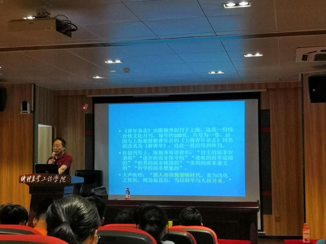赵教授梳理了五四运动思想史,先后阐述了三个问题:第一,五四运动的历史意义与中国共产党;第二,“五四精神”与新时代“爱国奋斗精神”;第三,新时代中国特色社会主义与中华民族伟大复兴。关于第一个问题,赵教授从对“新文化运动”的理解揭示五四运动与中国共产党之间的紧密联系。关于第二个问题,赵教授首先阐释了五四精神的核心内容为“爱国、进步、民主、科学”。他说五四精神归结起来是:忧国忧民的爱国主义精神,无私奉献的高度社会责任感,宣传民主科学的进步精神,追寻时代潮流、把握时代命运的伟大精神;站在中国革命的高度也可以概括为:爱国主义精神、民主科学精神。接着解读了习近平总书记在十三届全国人大一次会议闭幕式上的重要讲话中提出的新时代中国精神即伟大创造精神、伟大奋斗精神、伟大团结精神和伟大梦想精神,与五四精神之间的深层联系。关于第三个问题,赵教授指出通过前面两个问题的解答,我们谈五四精神、新时代爱国奋斗精神,归根到底都是为了实现中华民族伟大复兴这一共同理想。通过赵教授的讲解,同学们加深了对五四运动的历史意义、五四精神的理解及其当代价值,也加深了对新时代中国精神的理解。