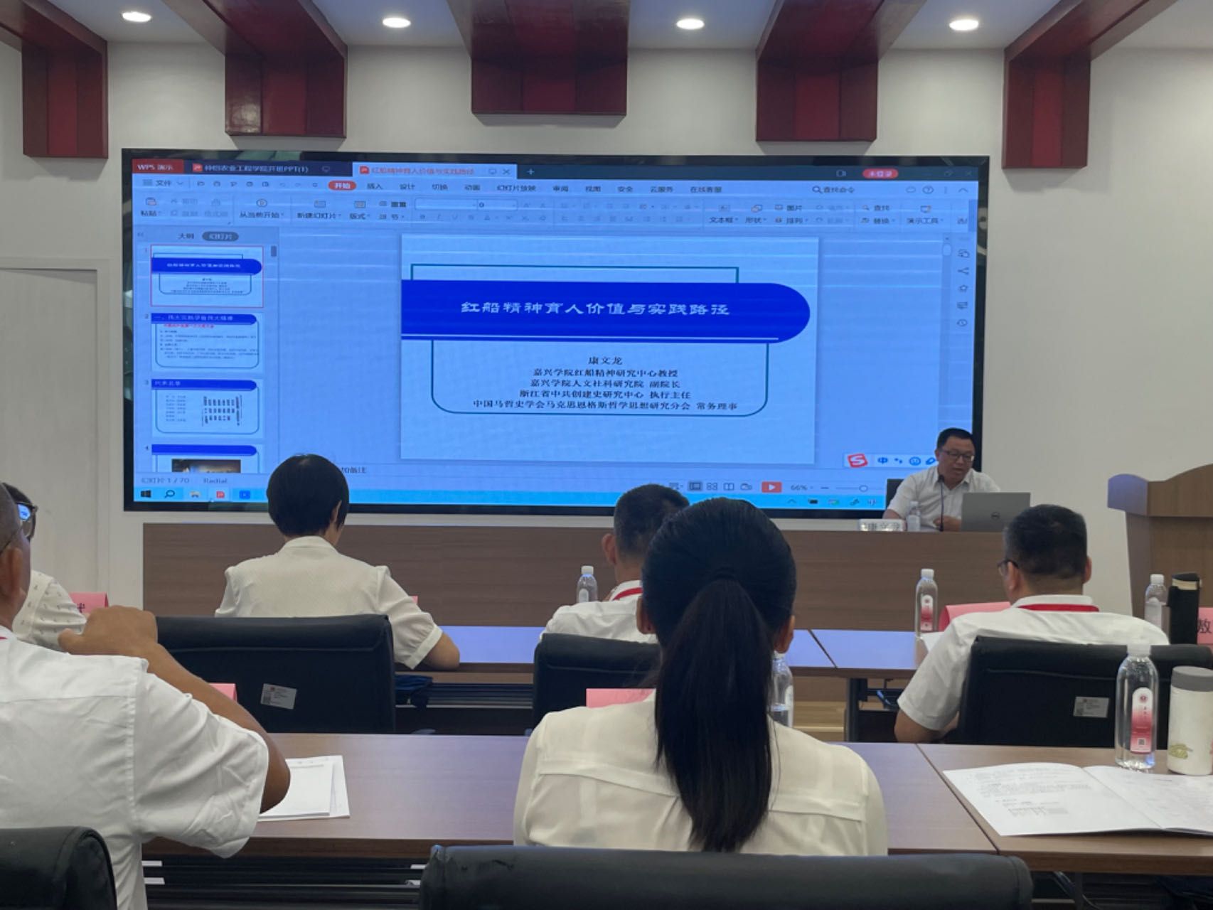康文龙教授的报告分为五大部分。一是详细梳理了中国共产党第一次全国代表大会上海会议和嘉兴南湖会议两个阶段的具体经过,讲述了伟大实践孕育出伟大“红船精神”的历史进程;二是以参与建党和致力妇女运动为中心,简要介绍了“红船卫士”王会悟的奋斗历程;三是介绍红船坐标的主要特点,阐述“红船精神”内核的生成;四是解析了“红船精神”的育人价值。最后,康教授还为学员们展示了嘉兴公司以“红船精神”育人的特色途径与成效。