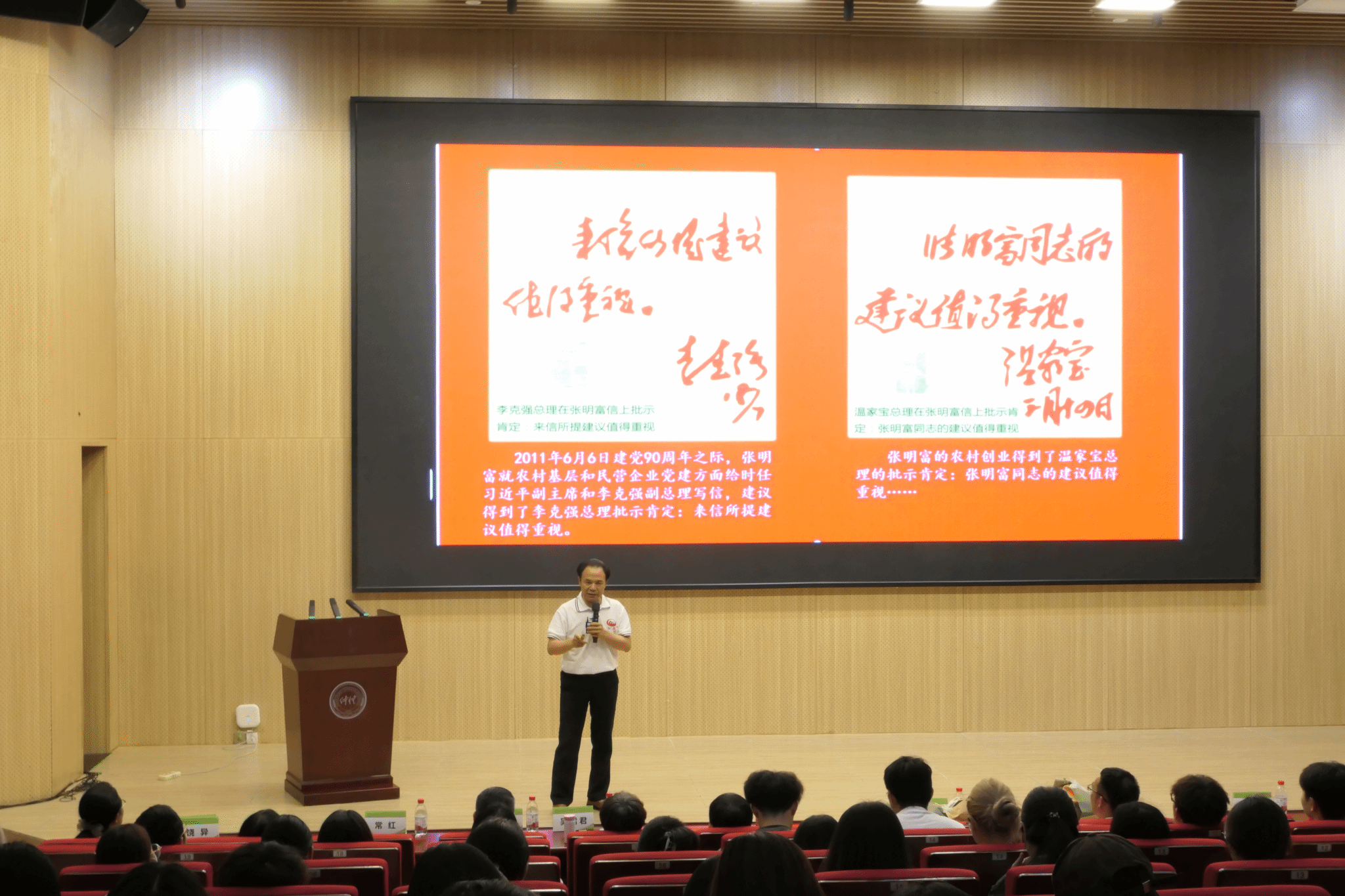 在课程的第一个环节,全国劳动模范、贵州梦润集团董事长张明富同志和全国劳动模范、广州沙田柠檬农产品专业合作社副理事长冯冠杰同志围绕“劳动创造价值,劳动开创未来”的主题为同学们深情讲述了他们的创业史。