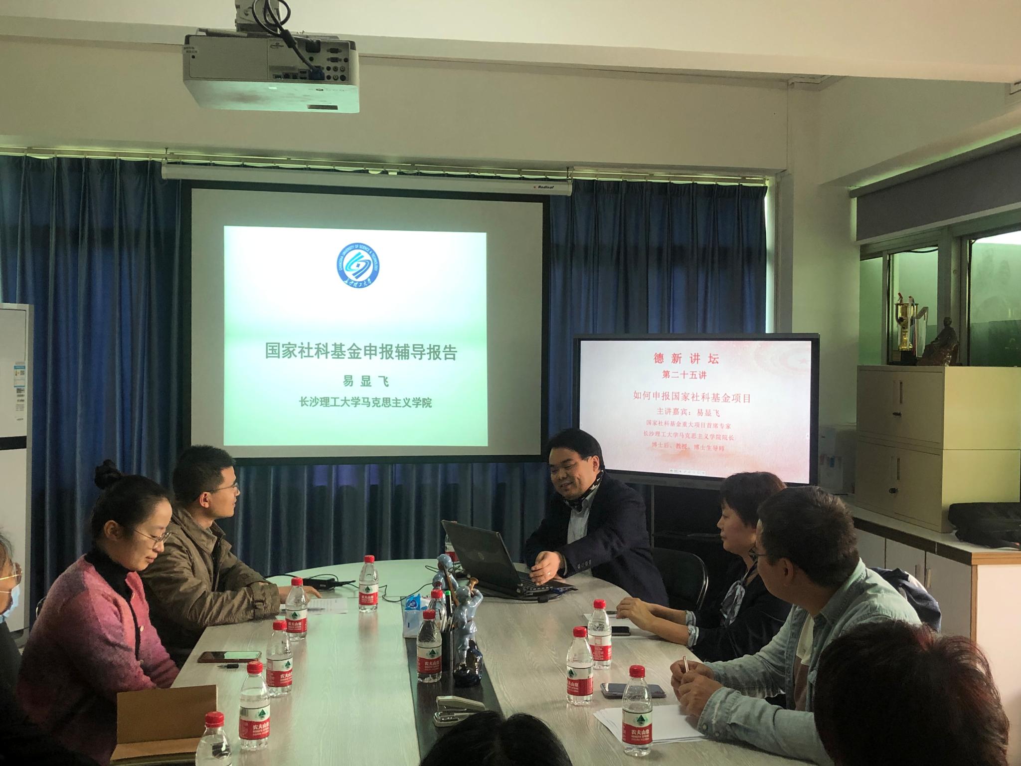 为提升公司青年教师的科研能力,12月23日下午,太阳成集团tyc122cc在海珠校区行政楼西704会议室举行了德新讲坛第二十五讲,主题是“如何申报国家社科基金项目”。主讲嘉宾易显飞教授是国家社科基金重大项目首席专家。哲学博士,中国社科院哲学博士后,教授,博士生导师。长沙理工大学马克思主义公司党委书记、学科负责人。湖南省省级“优秀研究生导师”,湖南省“名师工作室”负责人。
