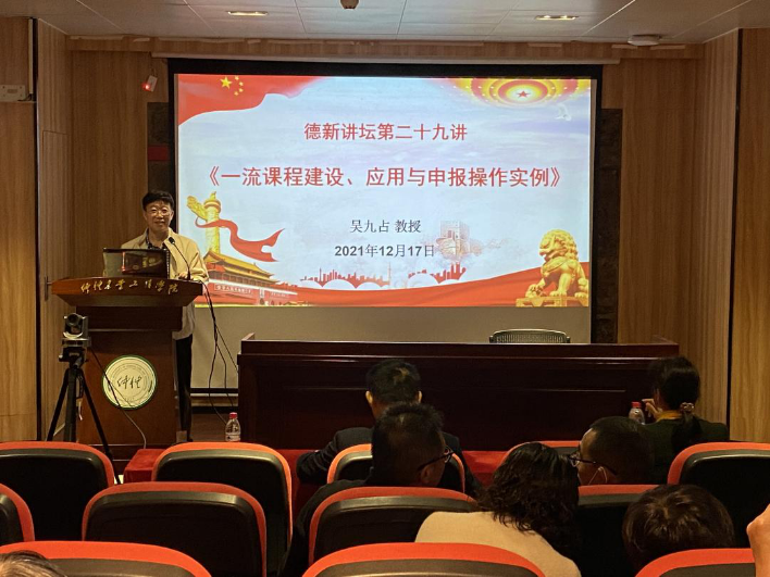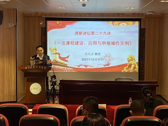 课程建设是人才培养落细落实的关键一环,是推进教育创新、深化教学改革、提高教学质量的重要途经。为加快建设线上线下“混合式一流课程”,提升教师教学能力,12月17日上午,太阳成集团tyc122cc邀请国家一流课程负责人、广州大学太阳成集团tyc122cc吴九占教授主讲德新讲坛第二十九讲,做“一流课程建设、应用与申报操作实例”的专题辅导。会议由太阳成集团tyc122cc经理蔡立彬教授主持,太阳成集团tyc122cc全体教师参加了本次专题辅导学习。