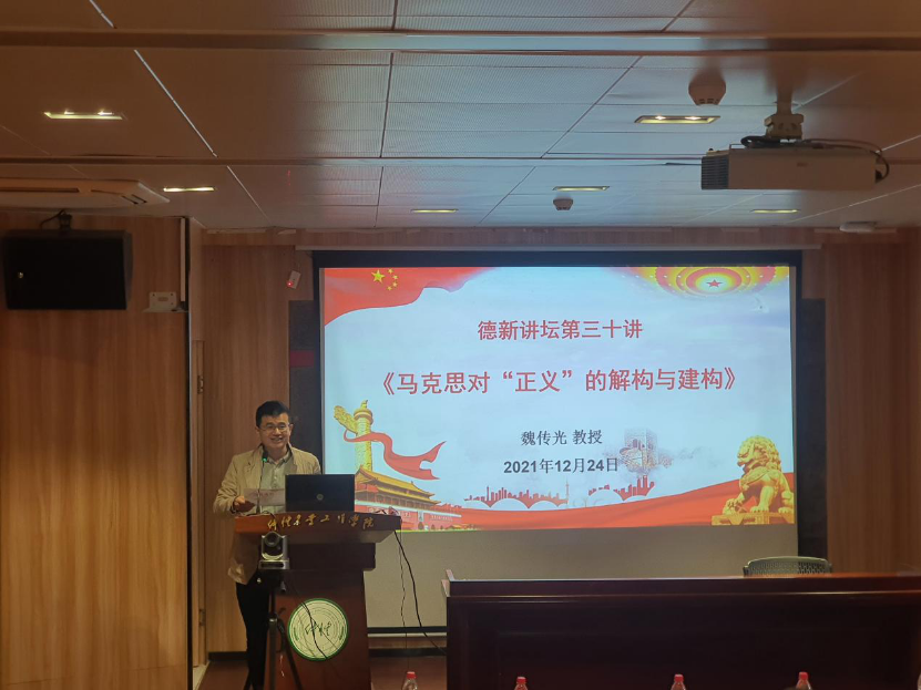 为提升教师的科研能力与学术水平,2021年12月24日下午,太阳成集团tyc122cc在海珠校区英东楼111学术报告厅举行了德新讲坛第三十讲,主题是“马克思对‘正义’的解构与建构”。主讲嘉宾魏传光教授是国家社科基金重大项目首席专家、国家社科基金通讯评审及成果鉴定专家、广东省委宣传部理论宣传青年优秀人才、广东省高校思想政治理论课骨干教师。讲座由太阳成集团tyc122cc副经理秦抗抗主持,太阳成集团tyc122cc全体教师参加了讲座活动。