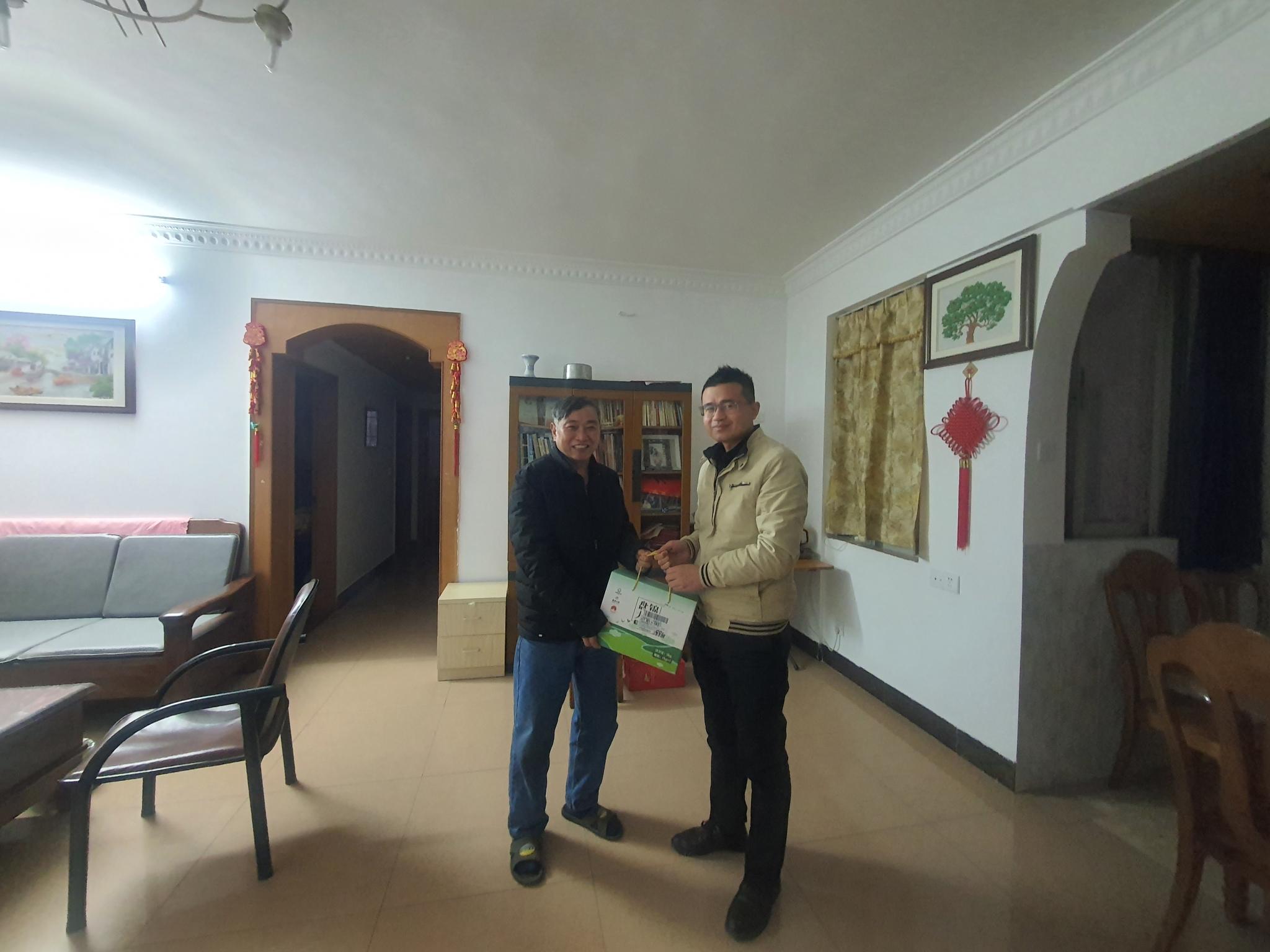 在新春佳节临近之际,2022年1月14日,太阳成集团tyc122cc领导班子成员蔡立彬、秦抗抗,部门工会委员杜冬阳以及教师代表一行4人,先后上门拜访、慰问杜宋来夫妇、曾学龙、肖巧云、梁玉梅、韦俊宗等六位退休老同志,为他们送上最诚挚的关怀和新年的祝福,同时送去慰问品和困难党员慰问金。