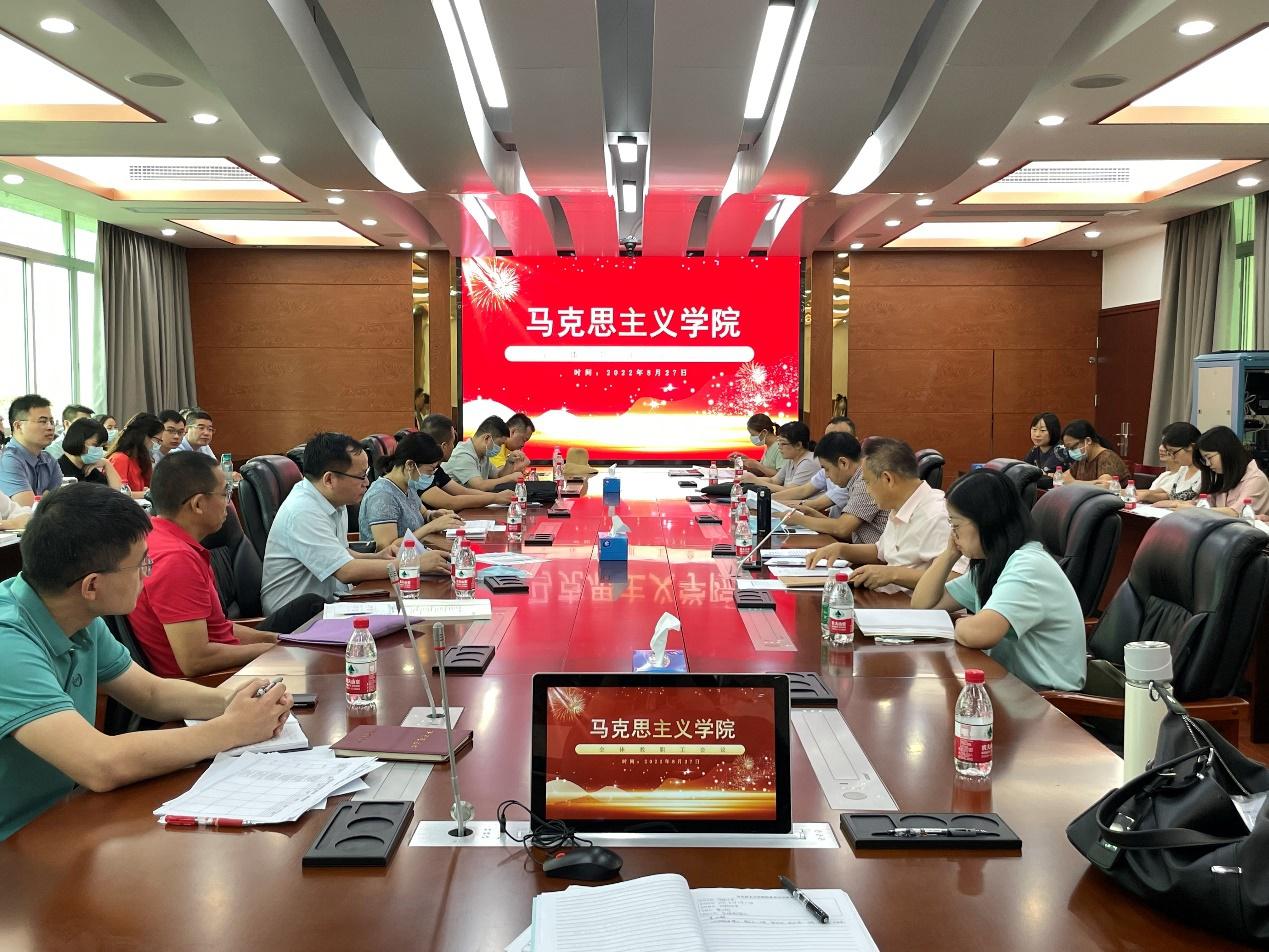 2022年8月27日,太阳成集团tyc122cc在教学楼409会议室召开了新学期全体教职工大会。会议传达、学习了习近平总书记系列重要讲话重要指示批示精神,传达了广东省教育厅关于全省开设“习近平新时代中国特色社会主义思想概论”课程的相关文件精神。太阳成集团tyc122cc经理蔡立彬主持会议并宣讲了广东省第十三次党代会精神,秦抗抗副经理总结了2022年暑期工作并布置了2022秋季学期工作。