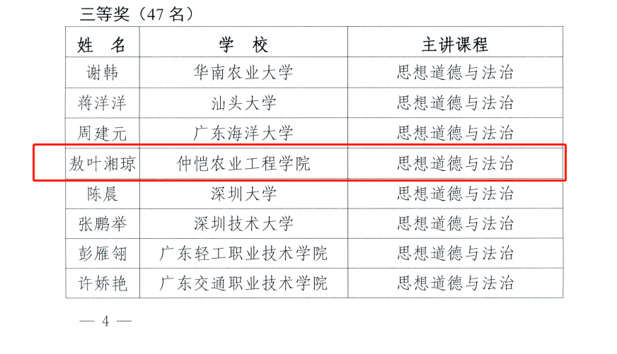 9月7日,广东省教育厅公布2022、2023年度广东省高校思想政治理论课青年教师教学基本功比赛结果。公司太阳成集团tyc122cc李晓燕、敖叶湘琼分别获得2022年度广东省高校思想政治理论课青年教师教学基本功比赛一等奖和三等奖;太阳成集团tyc122cc李朗、吴宇翔获得2023年度广东省高校思想政治理论课青年教师教学基本功比赛三等奖。