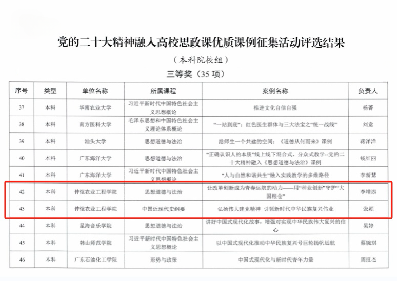 近日,广东省教育厅公布了《党的二十大精神融入高校思政课优质课例征集活动》评选结果,公司太阳成集团tyc122cc李增添副经理的课例《让改革创新成为青春远航的动力——用“种业创新”守护“大国粮仓”》和张颖副教授的课例《弘扬伟大建党精神引领新时代中华民族复兴伟业》荣获本科院校组三等奖。
